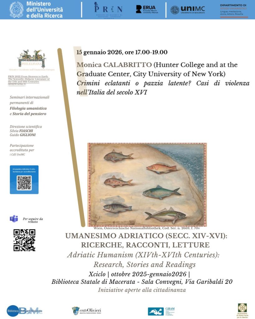 15 Gennaio 2026 @ 17:00 – 19:00 – Crimini eclatanti o pazzia latente? Casi di violenza nell’Italia del secolo XVI. – relatore Monica Calabritto (Hunter College and at the Graduate…